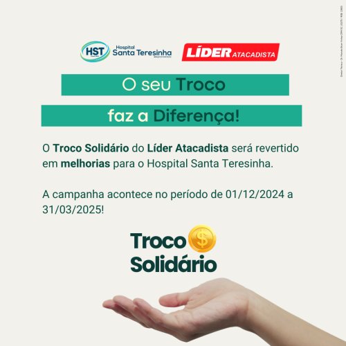 O Hospital Santa Teresinha, em parceria com a Rede de Supermercados Líder Atacadista, faz parte da campanha Troco Solidário.